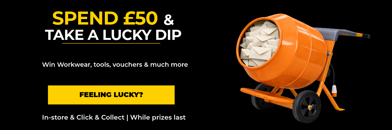 Pick an envelope from our Lucky Dip cement mixer after qualifying spend and see if you’ve won. Prizes include workwear, tools, BPS in-store vouchers, breakfast vouchers, Alexa Echo Pops and much more!